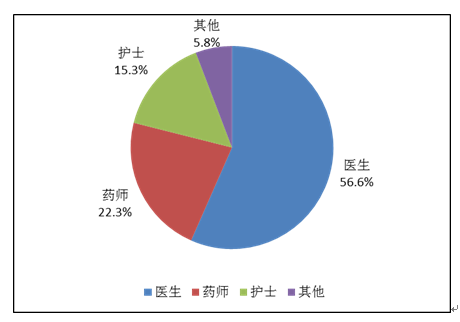 按照報告人職業(yè)統(tǒng)計,醫(yī)生占56.6%,藥師占22.3%,護(hù)士占15.3%,其他職業(yè)占5.8% (圖4)。