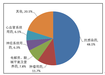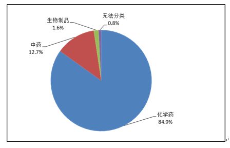 按照藥品類別統(tǒng)計,化學(xué)藥品占86.6%,中藥占12.6%,生物制品占0.8%。化學(xué)藥品排名居前的藥品類別是抗感染藥、心血管系統(tǒng)用藥、腫瘤用藥、神經(jīng)系統(tǒng)用藥、電解質(zhì)、酸堿平衡及營養(yǎng)藥;中藥排名居前的藥品類別是理血劑、補(bǔ)益劑、祛濕劑、開竅劑、清熱劑。