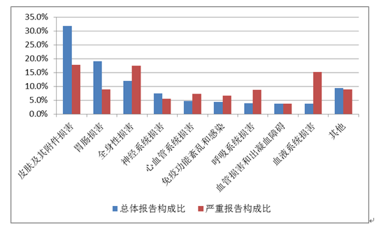 抗感染藥整體藥品不良反應(yīng)/事件報告中,口服制劑累及器官系統(tǒng)排名前5位的是胃腸損害、皮膚及其附件損害、神經(jīng)系統(tǒng)損害、肝膽損害、全身性損害;注射劑累及器官系統(tǒng)排名前5位是皮膚及其附件損害、胃腸損害、全身性損害、免疫功能紊亂和感染、神經(jīng)系統(tǒng)損害。